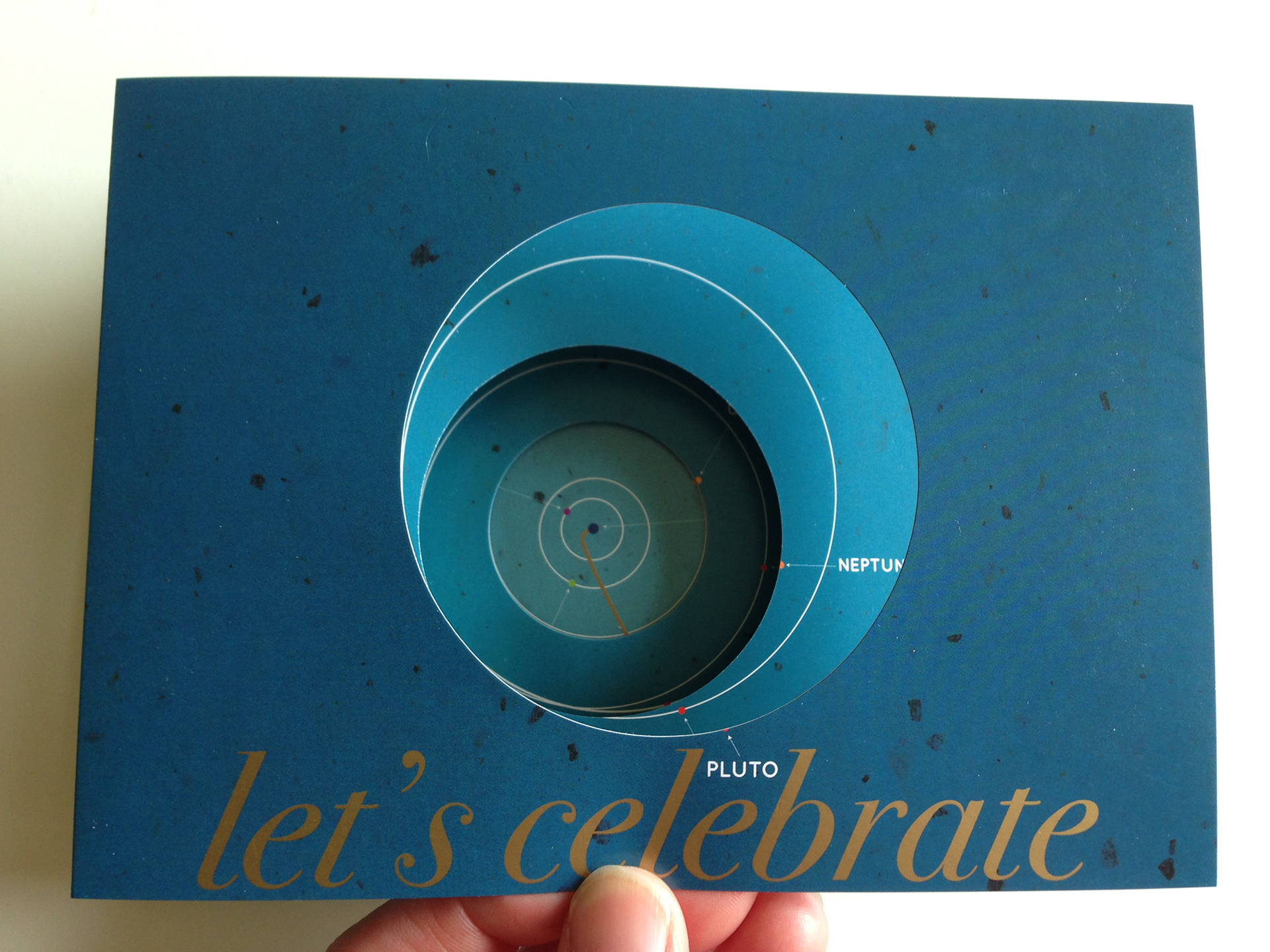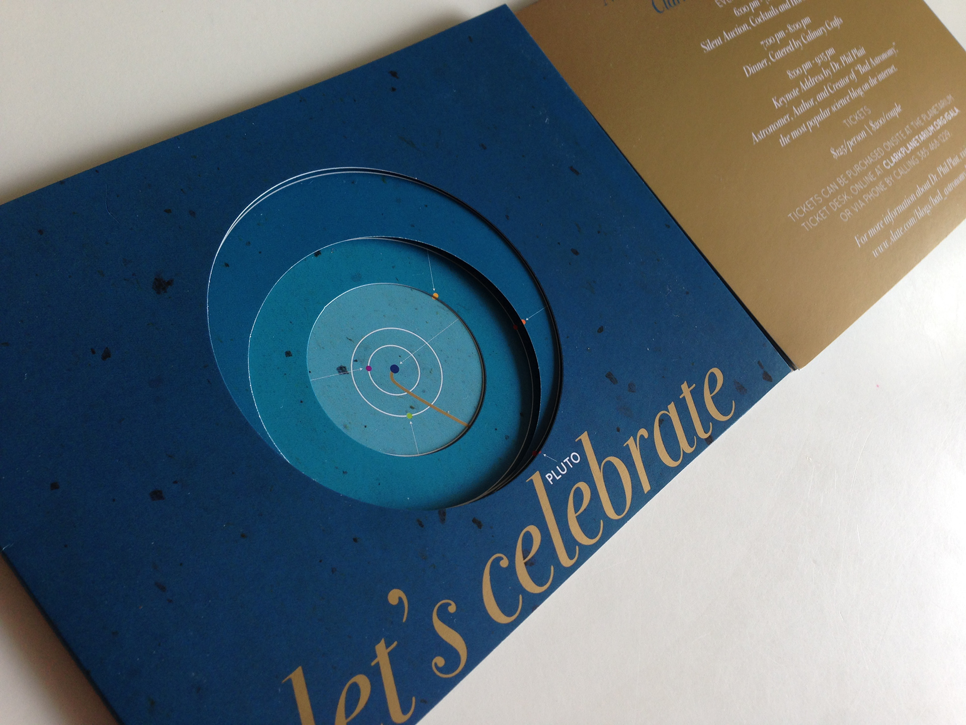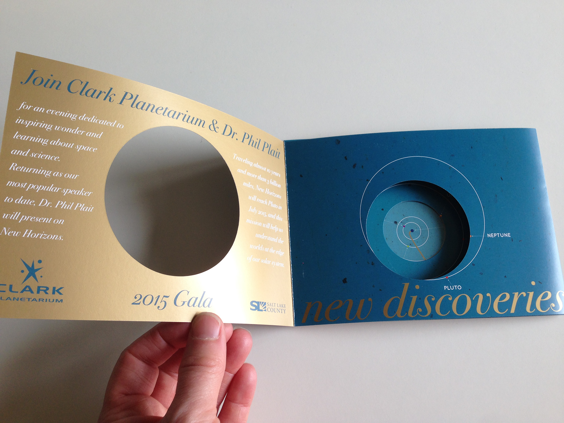 This year's Clark Planetarium's Gala concept centered around NASA's New Horizon 9-year mission to fly by Pluto. I created an invite to get people excited about the mission of the Planetarium and this awe-inspiring NASA mission by making an interactive invitation based on a orbital diagram from the mission itself. A gold metallic ink was used with shades of blue to evoke a sense of celebration and mystery. We carried this look throughout the entire gala event from signage to thank you cards.